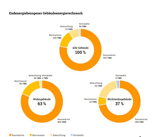 Wärme und Strom in Gebäuden sind mit 36 Prozent für mehr als ein Drittel des Gesamtenergieverbrauchs in Deutschland verantwortlich. Effizienztechnologien bieten viele Einsparpotenziale, insbesondere auch in Nichtwohngebäuden. Die Wärmewende ist dabei immer stärker als Teil einer integrierten Energiewende zu verstehen, bei der die Wechselwirkungen und Abhängigkeiten zwischen den Sektoren Strom, Gebäude, Verkehr und Industrie mitgedacht werden. Wie der Gebäudereport zeigt, spielen schon jetzt Querverbindungen wie die Erzeugung von Strom durch Wärme beziehungsweise von Wärme durch Strom eine wichtige Rolle. Gleichzeitig nehmen Gebäude eine zentrale Position in einem integrierten Energiesystem ein: Sie fungieren als Ort, an dem Energie produziert, gespeichert und abgegeben werden kann.