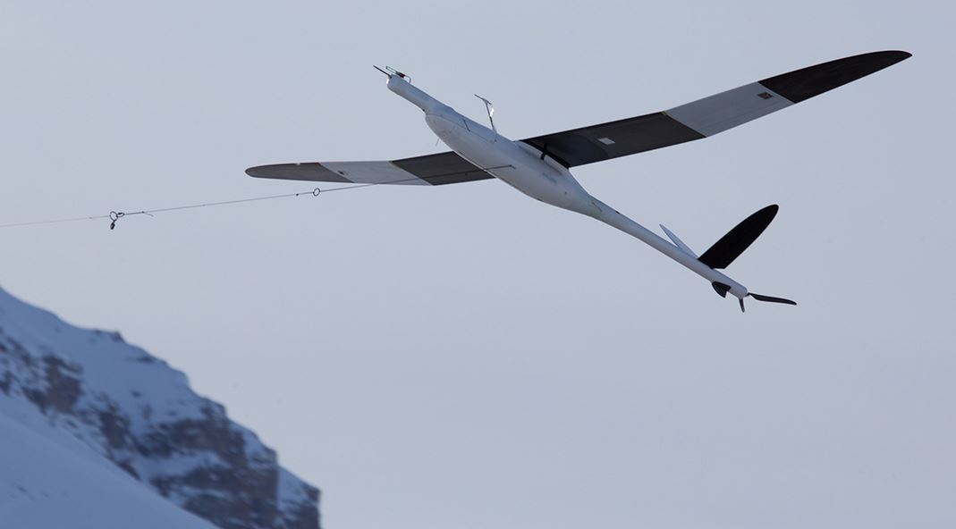 Das unbemannte Flugzeug ALADINA vor dem Zeppelinberg bei Ny-Ålesund. – Foto © Konrad Bärfuss/TU Braunschweig