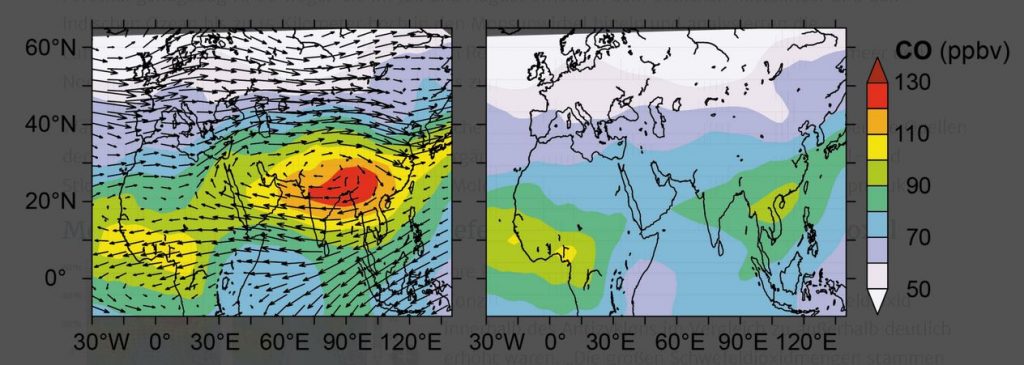 Modellergebnisse verdeutlichen die Luftverschmutzung in Südasien. Das linke Bild zeigt die Kohlenmonoxidemissionen (CO in ppbv: Teilen pro Milliarde in einem Volumen) in 12 bis 17 Kilometer Höhe. Rechts die Darstellung ohne Emissionen aus Südasien. Im linken Bild sind zudem die Winde über der Region dargestellt, wodurch man den Antizyklon gut erkennt, der durch den Monsun entsteht. – Grafik © MPI für Chemie