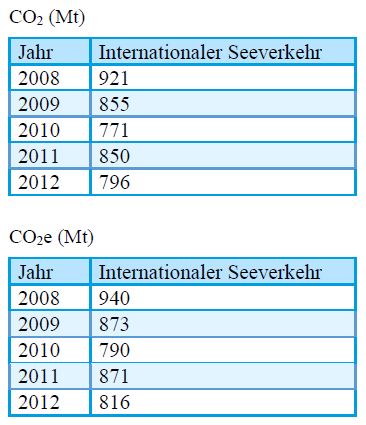 Laut der „Third IMO GHG Study“ haben sich die Treibhausgasemissionen (CO2 bzw. Treibhausgase in CO2-Äquivalenten) der Schifffahrt in der Periode 2008- 2012 wie folgt entwickelt (in Millionen Tonnen):