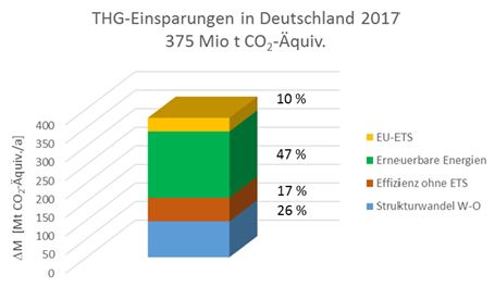 Dort stellen die Autoren „eindeutig“ fest, dass den Erneuerbaren Energien seit 1990 in Deutschland fast die Hälfte der Klimagassenkung (27 % in 2017) zu danken sei. Mit 26 % habe nach der Wende 1990 der Strukturwandel im Osten beigetragen. 17 % seien durch Effizienzmaßnahmen erreicht, und nur 10 % habe der Emissionshandel beigetragen, der in der öffentlichen Debatte allerdings oft als entscheidendes politisches Instrument für den Klimaschutz angesehen werde.