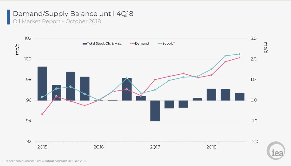 Die Welt hat mit 100 Millionen Barrel Öl pro Tag „neue Doppelspitzen für Nachfrage und Angebot“ des fossilen Rohstoffs erreicht. Das gab die Internationale Energieagentur (IEA) am 12.10.2018 in ihrem monatlichen Ölmarktbericht (Medienmitteilung) bekannt. Weder Nachfrage noch Angebot zeigen Anzeichen für ein baldiges Nachlassen, so die Pariser Organisation.