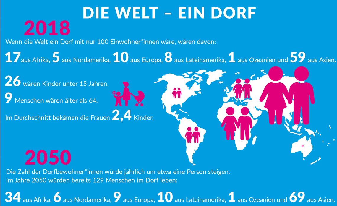 Wenn die Welt heute ein Dorf mit nur 100 Einwohnern wäre, wären davon 59 aus Asien, 17 aus Afrika, zehn aus Europa, acht aus Lateinamerika, fünf aus Nordamerika und einer aus Ozeanien. Die Zahl der Dorfbewohner würde bis zum Jahr 2050 auf 129 steigen. Heute leben etwa 5-10 % aller Menschen (homines sapientes), die seit 300 000 Jahren überhaupt auf diesem Planeten gelebt haben.