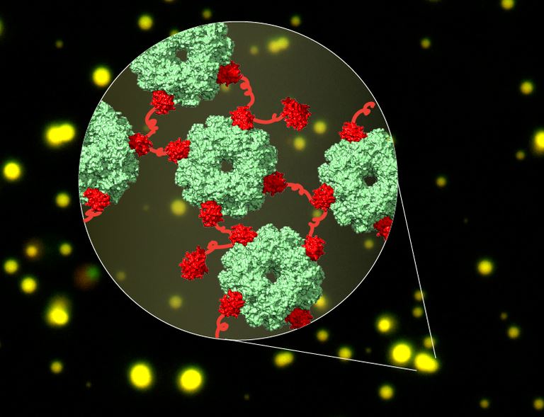 Kryo-EM Struktur des Komplexes aus CcmM (rot) und Rubisco (grün) in flüssigen Tröpfchen (gelb). Die Ausbildung des Netzwerks ist der erste Schritt der Carboxysombiogenese in Cyanobakterien – Illustration: Huping Wang, Andreas Bracher © MPI für Biochemie