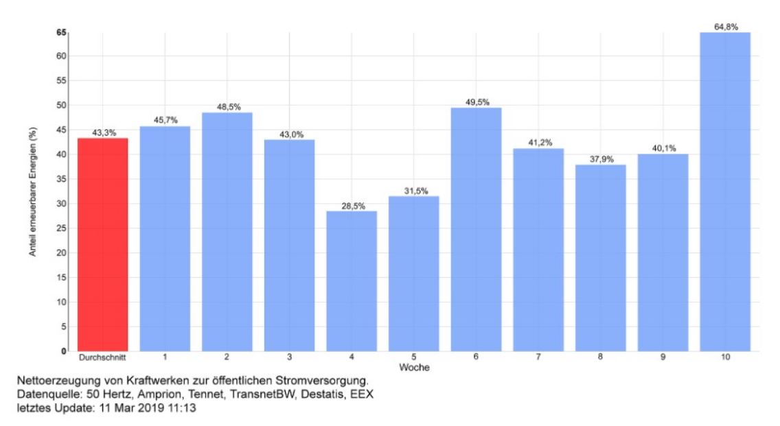 Die Erneuerbaren Energien lieferten in den ersten zehn Wochen des Jahres im Durchschnitt 43,3 Prozent der öffentlichen Nettostromversorgung. Damit liegen sie über dem Rekordwert von 2018.