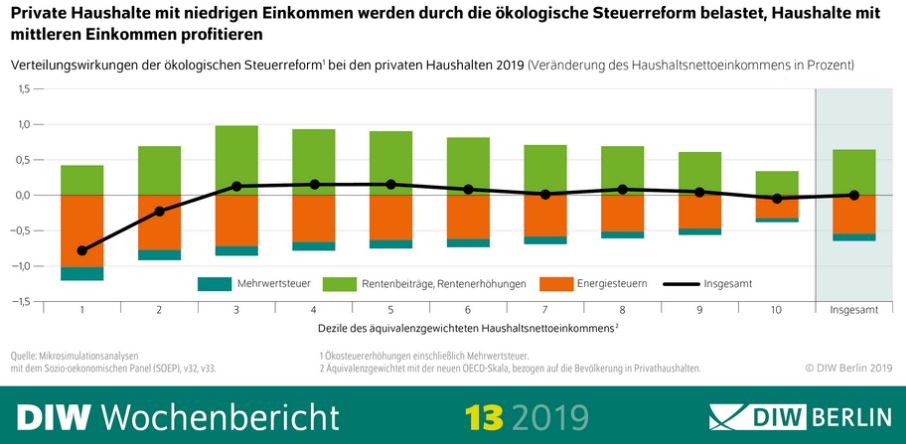 „Insgesamt ist die Steuer aufkommensneutral: Das, was Haushalte und die Wirtschaft draufzahlen, wird ihnen an anderer Stelle zurückerstattet“, so Bach weiter. Das Bild sei differenzierter, wenn man die verschiedenen Einkommensgruppen in den Blick nehme. Weil die Ausgaben für Energie in ihrem Budget schwerer wögen und sie kaum von Beitragssenkung und Rentenerhöhung profitierten, seien einkommensschwache Haushalte relativ von der Ökosteuer mehr betroffen als Haushalte mit mittleren oder hohen Einkommen.