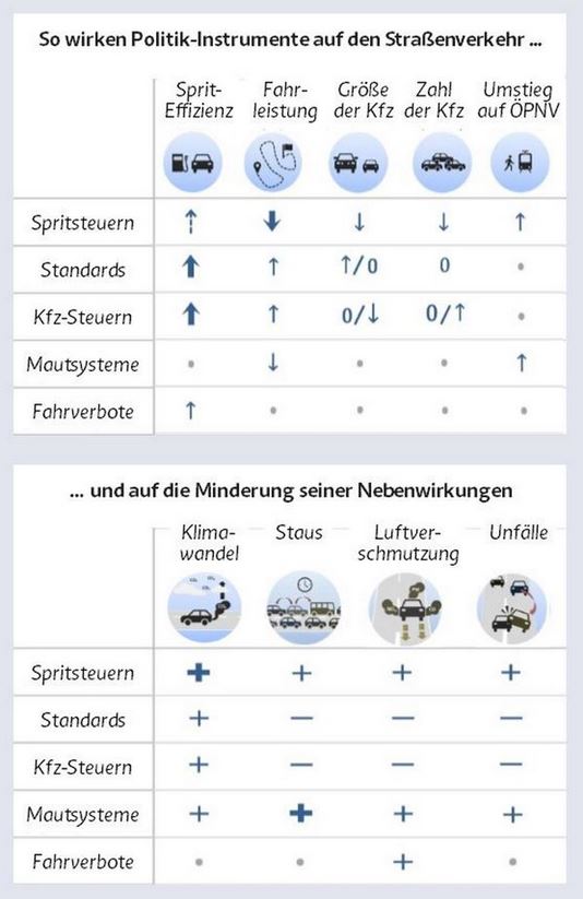 Mobilität erhalten, Nebenwirkungen minimieren – das geht wegen der komplexen Zusammenhänge nur durch ein Bündel von Maßnahmen. Im Fokus stehen fünf Instrumente, zu deren Wirkung es umfangreiche wissenschaftliche Erkenntnisse gibt.