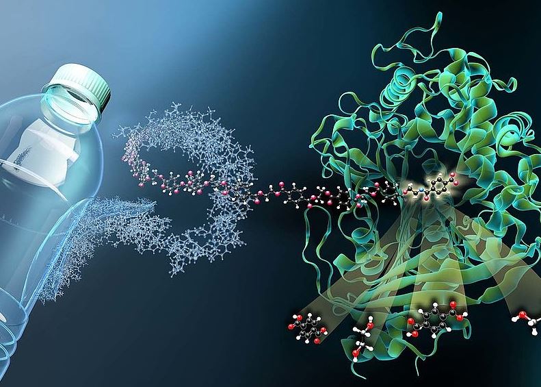 Erst 2016 hat eine Gruppe japanischer Forscher ein Bakterium entdeckt, das auf PET-Kunststoffen wachsen und sich teilweise davon ernähren kann. Wie sie herausfanden, besitzt dieses Bakterium zwei besondere Enzyme, die in der Lage sind, PET-Kunststoff abzubauen: PETase und MHETase. Zunächst zerlegt die PETase den Kunststoff in kleinere Bausteine, vorwiegend MHET, dann spaltet die MHETase diese in die zwei PET-Grundbausteine, Terephthalsäure und Ethylenglykol. Beide Bausteine sind sehr wertvoll für eine Neusynthese von PET – so dass erstmals ein nachhaltiger geschlossener Recyclingkreislauf – ohne Verwendung von Erdöl – möglich wird.