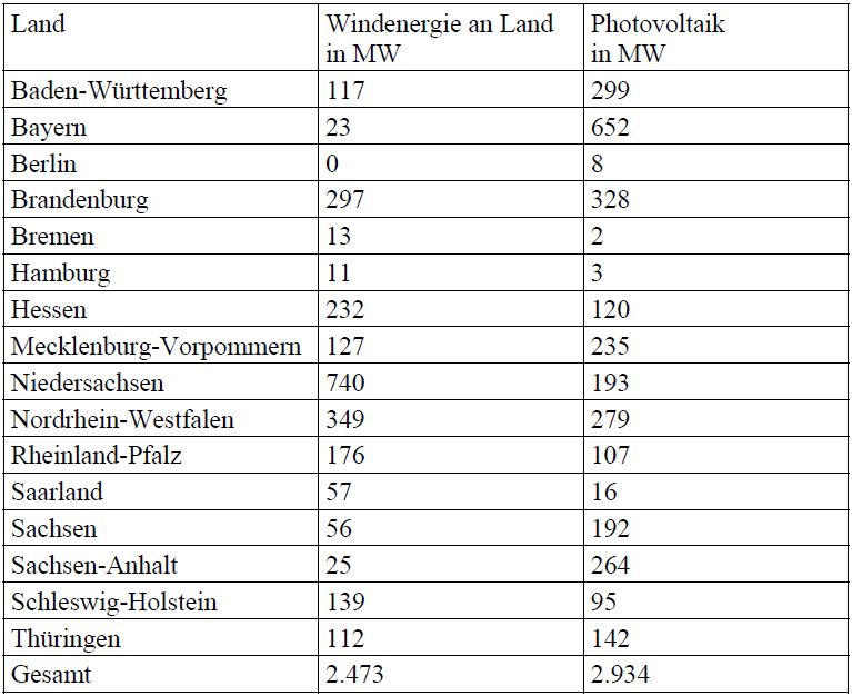 - Sind der Bundesregierung die Installationszahlen von Windenergie an Land und von Solarenergie für das Jahr 2018 bekannt und wenn ja, wie gestaltet sich diese ausdifferenziert nach Bundesländern (bitte tabellarisch auflisten) und wie bewertet sie diese?Der Bruttozubau bei Wind an Land betrug im Jahr 2018 rund 2,5 GW. Bei Photovoltaik belief er sich auf rund 2,9 GW. Nach vorläufigen Angaben auf Basis des Anlagenregisters teilt sich dieser Zubau wie folgt auf die Länder auf: