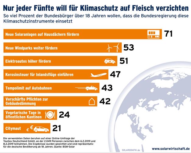 Immerhin etwa jeder zweite Bürger ist für die weitere Förderung der Windenergie und eine höhere Förderung von Elektroautos. Die Einführung einer Kerosinsteuer auf Inlandsflüge fordern 47 Prozent der Befragten. Ein allgemeines Tempolimit wünschen sich immerhin noch knapp 30 Mio. Bürgern (43 Prozent).
