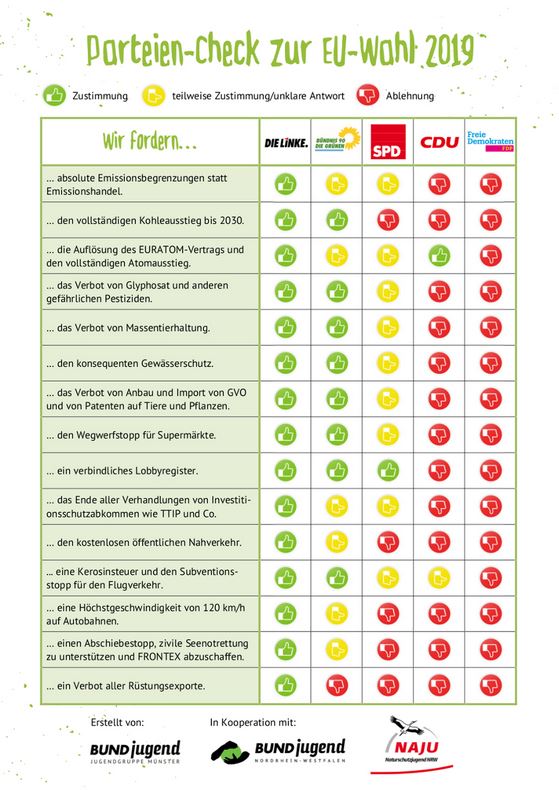 Die Linke schneidet beim Parteiencheck hingegen durchweg positiv ab. Zwar stellt die Partei in ihrem Europawahlprogramm Klimaschutz in der Reihenfolge hinter der Sozialpolitik an, doch in Kapitel sechs wird es konkret. Dort fordert sie einen sofortigen Stopp der Subventionen für fossile Energien und Atomkraft und nennt weitere konkrete Ziele für die Zukunft:
