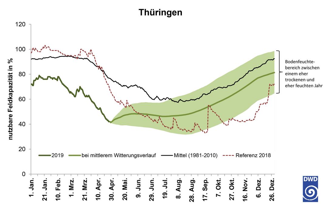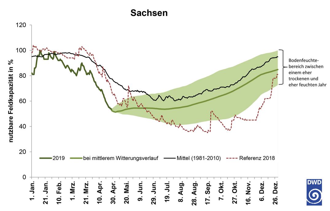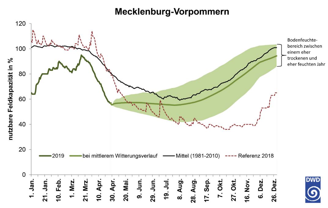 Dann würde die Landwirtschaft in Deutschland auch 2019 wieder mit Ertragseinbußen rechnen müssen. Außerdem könnten in diesem Jahr auch Wälder und Pflanzen mit Wurzeln, die die Feuchtigkeit in tieferen Bodenschichten anzapfen, betroffen sein. Die Bodenfeuchte in diesen tieferen Bodenschichten war 2018 durch die üppigen Niederschläge im Herbst und Winter 2017/2018 noch relativ hoch. Pflanzen, die diese Reserven anzapfen konnten, kamen deshalb gut über die Trockenheit hinweg. Aktuell seien diese Speicher, so der DWD, allerdings weit weniger gut gefüllt als im Vorjahr.