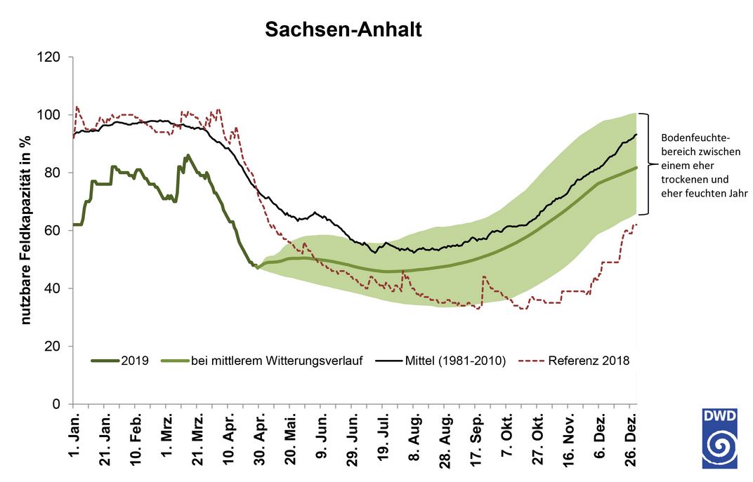 Die Abbildungen zeigen einen hypothetischen Verlauf der Bodenfeuchte der obersten 60 cm eines schweren Bodens unter Gras bis zum Ende des Jahres 2019 für einen mittleren Witterungsverlauf, einen eher trockenen Witterungsverlauf (Untergrenze des hellgrün eingefärbten Bereichs) und einen eher feuchten Witterungsverlauf (Obergrenze des hellgrünen Bereichs).