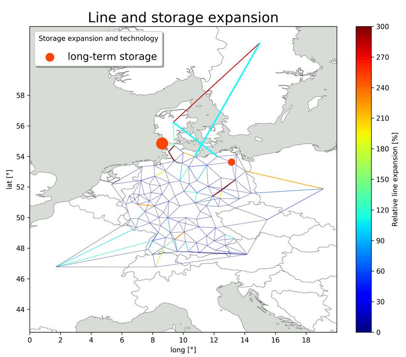 Für die Modellierung des künftigen Ausbaubedarfs berücksichtigt die Planungssoftware die jeweils kostengünstigste Option. So werden große Schwankungen zum Beispiel bei der Einspeisung künftiger Offshore-Windparks im ökonomisch sinnvollsten Verhältnis zwischen dem direkten Weitertransport und der Speicherung in der Region errechnet.