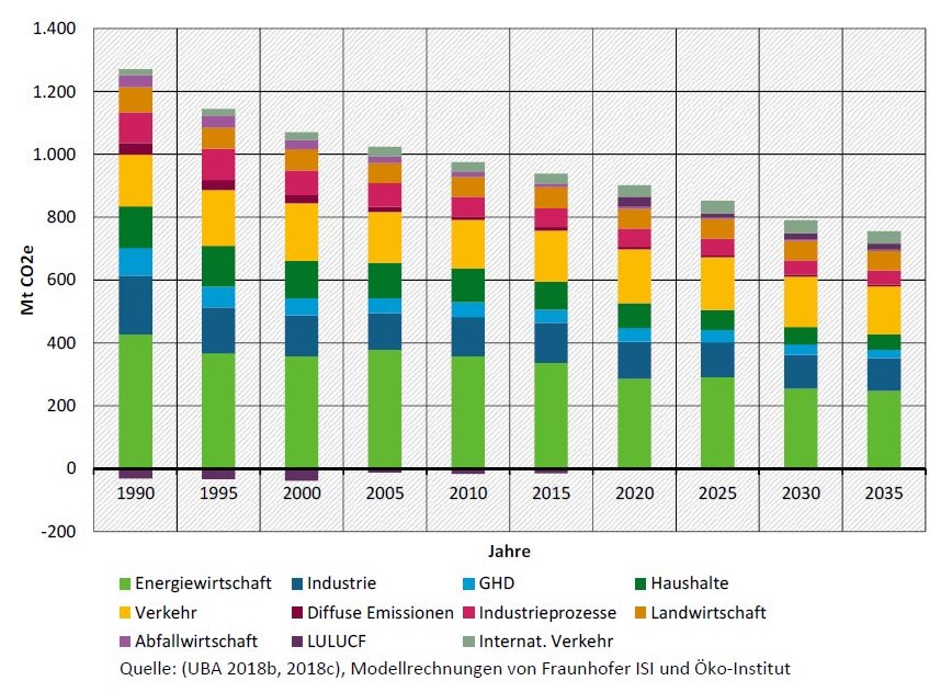 Die energiebedingten Treibhausgasemissionen werden wesentlich bestimmt durch die CO2– Emissionen aus der Verbrennung fossiler Energieträger in der Energiewirtschaft und den Endverbrauchssektoren Industrie, Haushalte, Verkehr, Gewerbe, Handel, Dienstleistungen sowie die flüchtigen CH4-Emissionen aus dem Kohlenbergbau sowie der Öl- und Gaswirtschaft. Die Treibhausgasemissionen aus der Verbrennung (Energiesektor, Industrie, Gewerbe, Handel, Dienstleistungen, Haushalte und Verkehr einschließlich internationalem Luft- und Seeverkehr) sinken im Zeitraum 2005 bis 2020 um 111 Mt CO22e, bis 2030 um 194 Mt CO2e und bis 2035 um 227 Mt CO2e. Dies entspricht einer Minderung von etwa 13 % bzw. 23 % bzw. 27 % gegenüber 2005 und einer Minderung von 28 % bzw. 36 % bzw. 39 % gegenüber 1990.