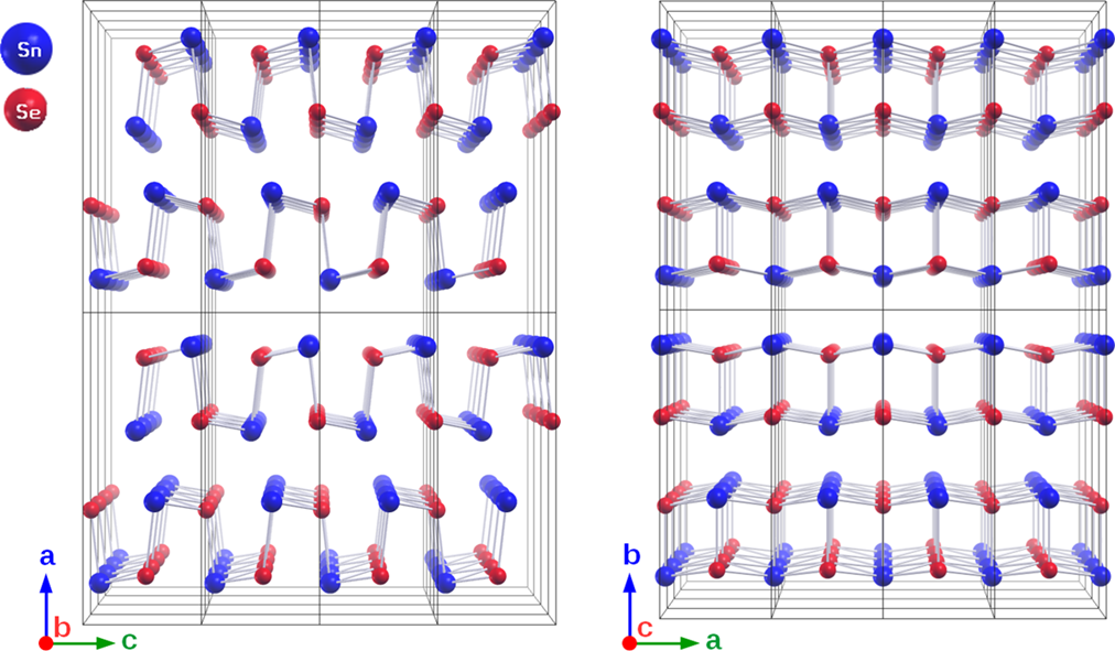Zinnselenid besitzt eine schichtartige orthorhombische Kristallstruktur (links). Oberhalb von 500 Grad Celsius (rechts) ändert sich die Anordnung der Schichten – Grafik © HZB