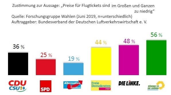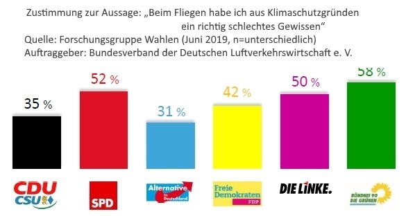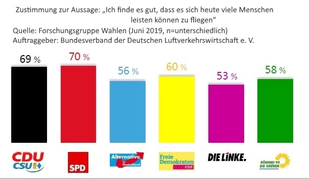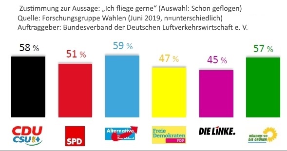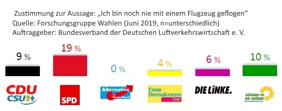 Im Vergleich zur 2014-er Umfrage haben sich nicht nur die Grünen-Wähler, sondern – bis auf die CDU-Klientel – alle verbessert, denn nur die CDU-Anhänger fliegen noch mehr (+ 4%) als 2014. Seinerzeit fungierte noch der CDU-Politiker und Journalist Klaus-Peter Siegloch als Chef-Lobbyist der Flieger-Interessensvertretung. Viele kannten ihn als ZDF-Gesicht, das die Sonntagsfrage der Forschungsgruppe Wahlen in die heimischen Wohnzimmer brachte.