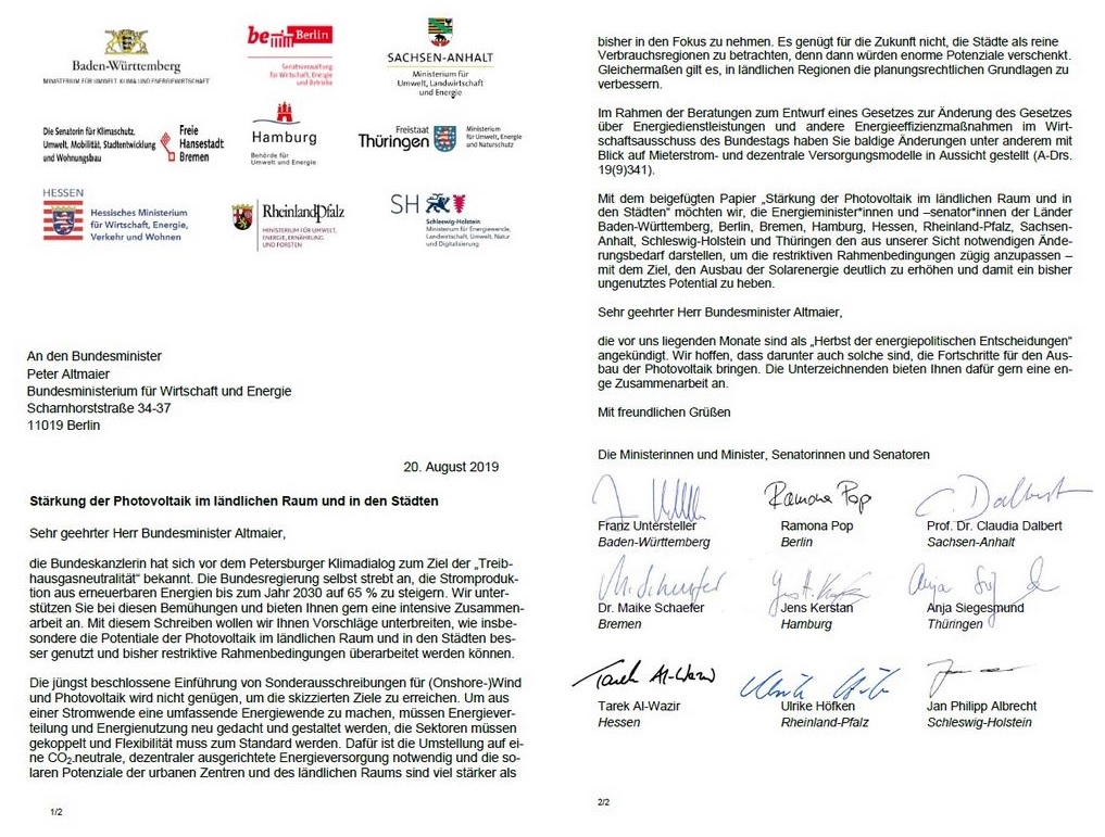 Der Brief unter dem Titel „Stärkung der Photovoltaik im ländlichen Raum und in den Städten“ fordert, endlich Maßnahmen zu ergreifen, die den Photovoltaik-Ausbau für die Fläche, aber vor allem auch in den Städten voranbringt. „Sehr geehrter Herr Bundesminister Altmaier, die vor uns liegenden Monate sind als ‚Herbst der energiepolitischen Entscheidungen‘ angekündigt. Wir hoffen, dass darunter auch solche sind, die Fortschritte für den Ausbau der Photovoltaik bringen. Die Unterzeichnenden bieten Ihnen dafür gern eine enge Zusammenarbeit an“, heißt es am Ende des Briefes, der pv magazine vorliegt. Dem Brief haben die Minister und Senatoren ein siebenseitiges Positionspapier beigefügt, in denen sie verschiedene Forderungen aufstellen.