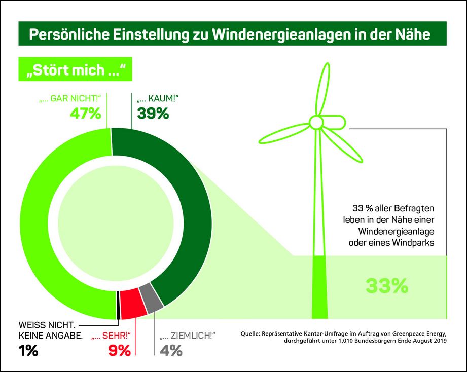 Eine große Mehrheit von Bundesbürgern, die in der Nähe von Windkraftanlagen leben, fühlt sich von diesen kaum oder gar nicht beeinträchtigt. Das zeigt eine repräsentative Umfrage, die das Meinungsforschungsinstitut Kantar Ende August im Auftrag des Ökoenergieanbieters Greenpeace Energy durchführte. Danach gab jeder Dritte der insgesamt 1.010 Befragten an, in der Nähe eines Windgenerators oder eines Windparks zu leben. 86 Prozent dieser Betroffenen fühlen sich laut Umfrage „kaum“ oder „gar nicht“ durch die Anlagen gestört.