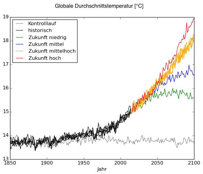 Das AWI-Klimamodell enthält die wesentlichen natürlichen Treiber der Erdtemperatur wie solare Einstrahlung, natürliche Treibhausgas- und Aerosolkonzentrationen und vulkanische Aerosole. Die graue Linie steht für den Kontrolllauf mit diesen natürlichen Treibern und Treibhausgaskonzentrationen aus dem Jahr 1850 von 284 ppm CO2. Die schwarzen Linien zeigen die historische Entwicklung der globalen Mitteltemperatur mit sich erhöhenden Treibhausgaskonzentrationen ab 1850 bis zu 400 ppm CO2 heute, die zu einer globalen Netto-Erwärmung von etwa 1 °C geführt haben. Die farbigen Linien zeigen die mögliche zukünftige Entwicklung der globalen Mitteltemperatur je nach Emissionsszenario.