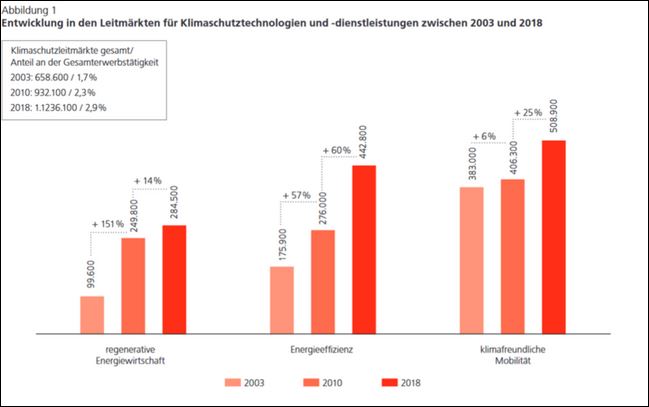 Klimaschutztechnologien und -dienstleistungen haben demnach seit der Einführung des Erneuerbaren-Energien-Gesetzes (EEG) im Jahr 2000 zu „Beschäftigung in erheblichem Maße“ geführt. Besonders in der Erneuerbaren-Energien-Wirtschaft und in den Bereichen Energieeffizienz und klimafreundliche Mobilität erwarten die Autoren ein weiteres Wachstum.
