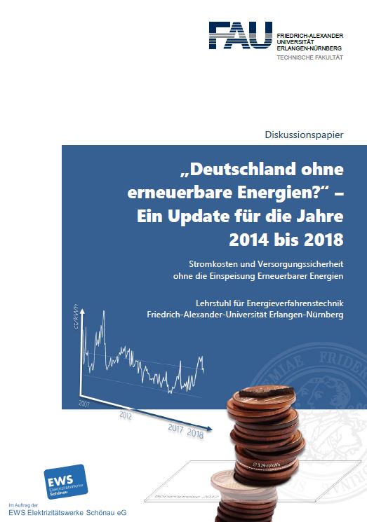 Das Update einer Studie von Wissenschaftlern der Friedrich-Alexander-Universität Erlangen-Nürnberg (FAU) und des Energie Campus Nürnberg (EnCN) im Auftrag der Elektrizitätswerke Schönau (EWS) für die Jahre 2014 bis 2018 räumt erneut mit dem Vorurteil gegenüber der Energiewende auf, Ökostrom verteure den Strompreis. Im Gegenteil: In den vergangenen vier Jahren haben deutsche Stromkunden 40 Mrd. € gespart, weil Erneuerbare-Energien-Anlagen in großem Umfang Strom ins Netz eingespeist haben. Seit 2011 sind es sogar rund 70 Mrd. € gewesen. 91 könnten es bis 2023 sein, wenn der Ausbau verdreifacht würde.