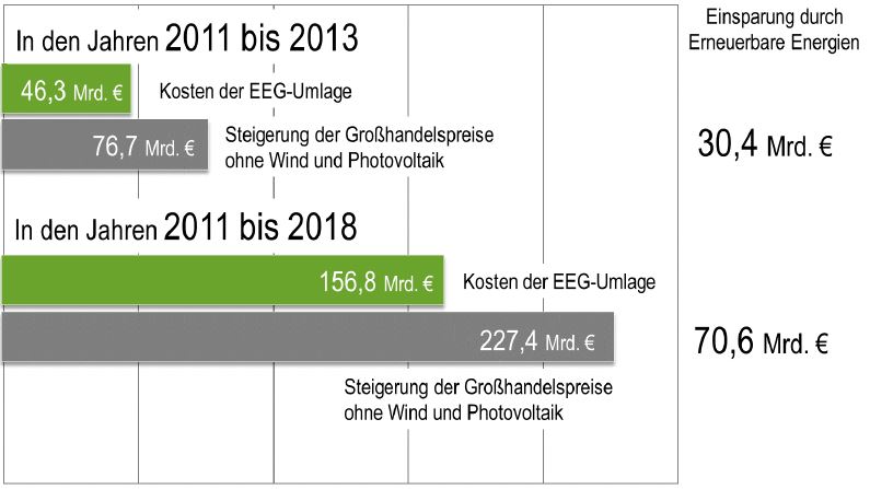 Die FAU-Strompreisstudie 2015 („Erfolg in Sachen Energiewende: EE sparten Stromverbrauchern 2013 ganze 11,2 Milliarden Euro“ – siehe: solarify.eu/strompreisdiskussion-obsolet) rekonstruierte auf Grundlage historischer Preisdaten des Day-Ahead-Marktes der deutschen Strombörse, welche Preise sich an der Strombörse in den Jahren 2011 bis 2013 ohne die Einspeisung aus Wind und Photovoltaik eingestellt hätten. Die Studie hatte gezeigt, dass die Mehrkosten aufgrund höherer Großhandels-preise die Kosten der EEG-Umlage in den Jahren 2011 bis 2013 um etwa 28,7 Mrd. Euro überschritten hätten1.