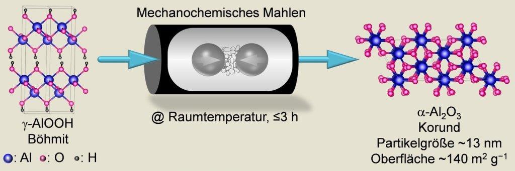 Inzwischen können die Chemiker auch erklären, warum ein so banaler Vorgang wie das Mahlen eine Route zu einem Mineral eröffnet, das sonst nur unter harschen Bedingungen und schon gar nicht in Nanoform zu bekommen ist. Zum einen beeinträchtigen die Defekte wie Risse, Brüche und Stufen, die beim Mahlen entstehen, die Stabilität von Korund weniger als die von weicheren Aluminiumoxiden. Korund entsteht deshalb bevorzugt. Zum anderen liefern die Stöße, die das Material in der Mühle erfährt, genau die mechanische Energie, die für den ziemlich aufwändigen Umbau der Kristallstruktur zum Korund nötig ist. Die vergleichsweise niedrigen Temperaturen bei dem Prozess verhindern zudem, dass die Nanoteilchen zu größeren Körnern verklumpen.