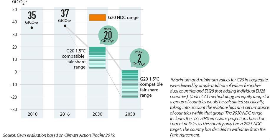 Gegenwärtig bewegt sich kein G20-Staat mit seinen nationalen Klimazielen (NDCs “nationally determined contribution”) im Rahmen des 1,5°C Limits. Mit der jetzigen Zielsetzung wären die Emissionen im Jahr 2030 doppelt so hoch wie für eine Begrenzung der Erderwärmung auf 1,5°C notwendig. Im Angesicht des Umstandes, dass nur ungefähr die Hälfte der G20 Länder voraussichtlich ihre nationalen Klimaziele erreichen oder übertreffen werden, zeigt sich hier ein deutliches Potenzial zu Ambitionssteigerungen im Zuge der NDC-Erhöhung im Jahr 2020.