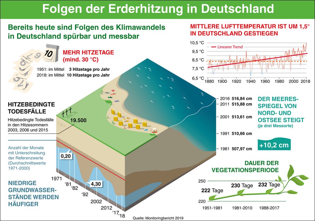 Das zeigt der zweite Monitoringbericht der Bundesregierung, der am 26.11.2019 vom Bundesumweltministerium (BMU) und dem Umweltbundesamt (UBA) in Berlin vorgelegt wurde. Demnach hat sich die mittlere Lufttemperatur in Deutschland von 1881 bis 2018 um 1,5 Grad erhöht. Allein in den letzten fünf Jahren sei diese um 0,3 Grad angestiegen. Dadurch komme es unter anderem zu mehr Gesundheitsrisiken durch die Hitzebelastung, einem Anstieg der mittleren Oberflächentemperatur der Nordsee sowie zu stärkeren Ertragsschwankungen in der Landwirtschaft, wie es in der gemeinsamen Presseerklärung heißt.