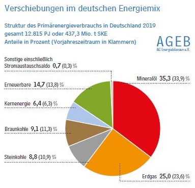 Die Anteile der verschiedenen Energieträger am nationalen Energiemix hätten sich 2019 gegenüber dem Vorjahr weiter verschoben: Bei den fossilen Energien sei es in Summe zu einem Rückgang gekommen, so dass die Energieversorgung in Deutschland ihre Kohlenstoffintensität weiter habe verringern können. Kennzeichnend bleibe aber ein breiter Energiemix. Gut 60 Prozent des inländischen Energieverbrauchs seien auf Öl und Gas entfallen. Stein- und Braunkohle hätten zusammen etwa 18 Prozent des Verbrauchs gedeckt. Die Erneuerbaren hätten ihren Beitrag auf beinahe 15 Prozent gesteigert.