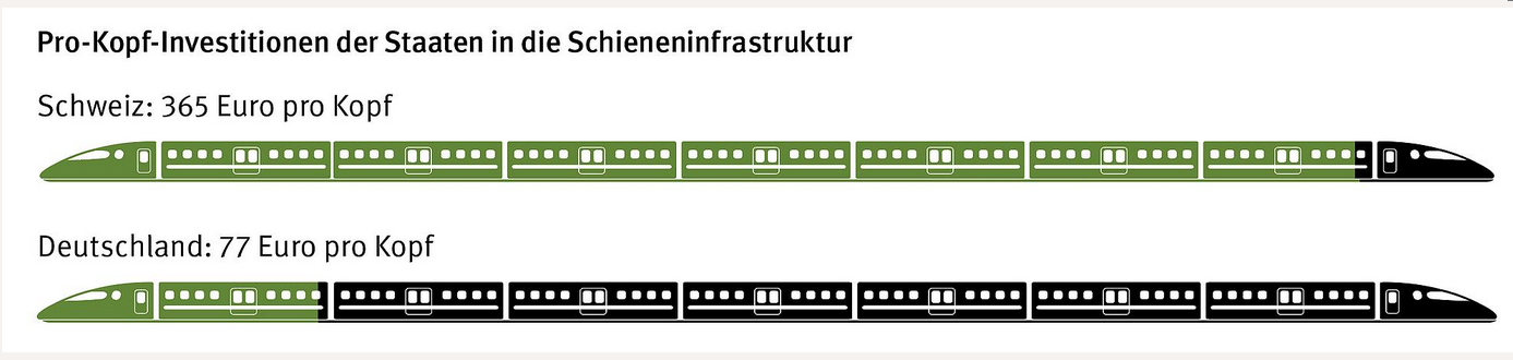 Wie es anders geht, zeigt die Schweiz. 365 Euro pro Kopf investiert der Staat jährlich in die Schieneninfrastruktur. Das hat Auswirkungen auf die Mobilität der Einwohner. Über 2.300 Kilometer legt der durchschnittliche Schweizer jedes Jahr mit der Bahn zurück. Weltweit hat nur Japan einen besseren Wert. Der Dachverband des öffentlichen Verkehrs in der Schweiz rühmt sich wohl zu Recht für seine Attraktivität. So unterhält die Schweiz das dichteste Eisenbahnnetz der Welt und Ortschaften ohne Eisenbahnanschluss sind generell durch Busse angebunden. Das viele Geld für die Schieneninfrastruktur wirkt sich derweil nicht nur positiv auf die Fahrgastzahlen aus, auch der Güterverkehr profitiert.