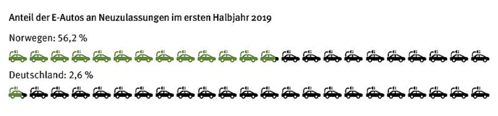 „Deutschland hat Norwegen bei den E-Autos überholt“, twitterte stolz das Social-Media-Team der CDU im Sommer. Und tatsächlich: 48.000 E-Autos wurden in Deutschland im ersten Halbjahr 2019 verkauft, dem stehen 44.000 in Norwegen gegenüber. Doch der Vergleich hinkt. Auf 82 Millionen Deutsche kommen gerade einmal 5,3 Millionen Norweger. So sind gerade mal 2,6 Prozent der neuen Autos in Deutschland elektrisch, in Norwegen beträgt ihr Anteil dagegen stolze 56,2 Prozent.