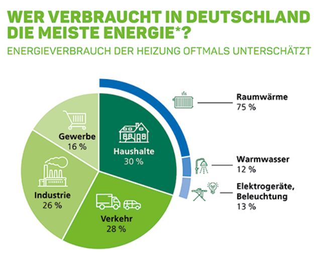 Auf private Haushalte entfallen rund 30 Prozent des deutschen Energieverbrauchs, drei Viertel davon allein für Raumwärme. Bislang stammen weniger als zehn Prozent dieses Energiebedarfs aus erneuerbaren Quellen, der größte Teil aus Öl und Gas.
