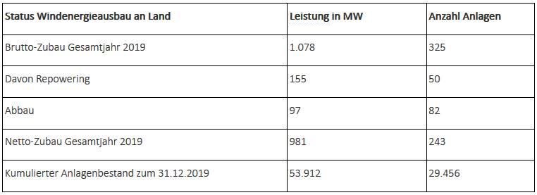 Nach den von der Deutschen WindGuard ermittelten Zahlen hat der Windenergie-Zubau den niedrigsten Stand seit Einführung des Erneuerbare-Energien-Gesetzes (EEG) im Jahr 2000 erreicht. Der Ausbau lag damit deutlich unter der von Bundesverband WindEnergie (BWE) und VDMA Power Systems zur Jahresmitte 2019 geschätzten Prognose von 1.500 MW. Nach Schätzungen der Branche ist bei wachsender Bruttostromnachfrage ein Zubau von rund 5.000 MW pro Jahr erforderlich, um das 65 Prozent-Ziel bis 2030 zu erreichen.