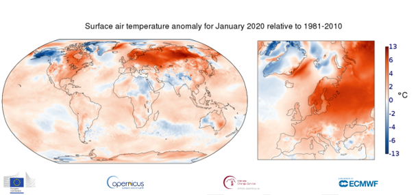 Der Copernicus-Klimadienst (C3S) bestätigte, dass der Januar 2020 weltweit gleichauf mit dem wärmsten Januar 2016 seit Beginn der Aufzeichnungen liegt. In Europa war der Januar 3,1°C wärmer als der Referenzzeitraum und 0,2°C wärmer als der Januar 2007, was ihn zum wärmsten Januar in Europa macht.