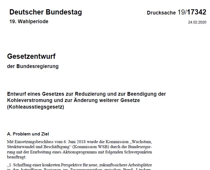 „Ziel dieses Gesetzes ist es insbesondere, die Verstromung von Kohle in Deutschland bis spätestens Ende des Jahres 2038 schrittweise und möglichst stetig auf null zu reduzieren und dadurch Emissionen zu reduzieren. Dies dient der Erreichung des Sektorziels 2030 für die Energiewirtschaft sowie einen Beitrag zur Schließung der Emissionsminderungslücke in 2020 zu leisten.“