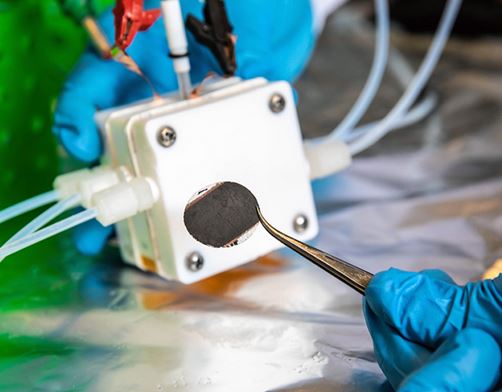 In dem verbesserten Elektrolyseur läuft die Reaktion in einer dünnen Schicht ab, die einen Katalysator auf Kupferbasis mit Nafion, einem ionenleitenden Polymer, kombiniert. Die einzigartige Anordnung dieser Materialien ermöglicht eine 10mal höhere Reaktionsgeschwindigkeit als bei früheren Designs – Foto © Daria Perevezentsev.