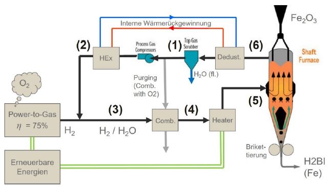 Im vorgestellten Konzept wurde aufgezeigt, wie ein Prozess zur Reduktion von Eisenerz mit regenerativ erzeugtem Wasserstoff aussehen könnte und welcher Energiebedarf zu erwarten ist. Aufgrund der Erfahrungen im Betrieb einer konventionellen Direktreduktionsanlage kann das Konzept als technisch machbar angesehen werden. Es stellt eine Weiterentwicklung des bestehenden Prozesses dar, der aktuell mit rund 60 % Wasserstoff im Reduktionsgas arbeitet. Die erforderlichen Technologien sind größtenteils bereits vorhanden und technisch erprobt, so dass hier keine Hemmnisse bestehen. Eine Kostenabschätzung ergibt aber, dass es unter den aktuellen Rahmenbedingungen keine Anreize gibt, in eine entsprechende Technik zu investieren. Insbesondere die enormen Kosten für den Betrieb einer Power-to-Gas-Anlage bzw. einer H2BI-Anlage machen dieses Konzept unwirtschaftlich. Es bleibt somit eine politische Entscheidung, ob entsprechende Förderungen für eine klimaneutrale Stahlerzeugung geschaffen werden. Ansonsten droht das Verfehlen der Klimaschutzziele oder eine Verdrängung der deutschen Stahlproduzenten durch Wettbewerber außerhalb der EU.