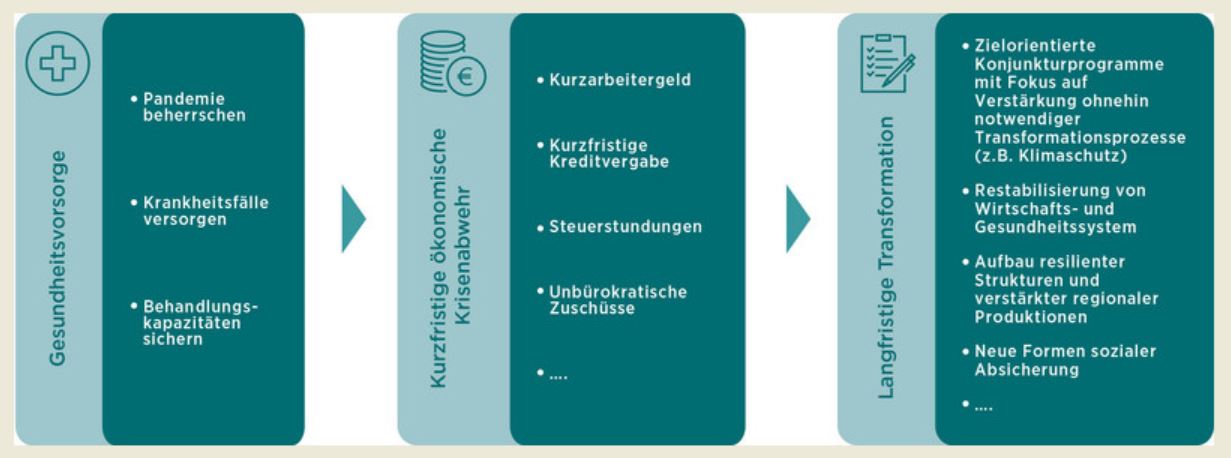 Im aktuellen Diskussionspapier „Folgen der Corona-Krise und Klimaschutz – Langfristige Zukunftsgestaltung im Blick behalten“ unterscheiden die beiden wissenschaftlichen Geschäftsführer des Wuppertal Instituts, Schneidewind und Fischedick, zwischen der Gesundheitsvorsorge (1), der kurzfristig ökonomischen Krisenabwehr (2) und der langfristigen Transformation (3).