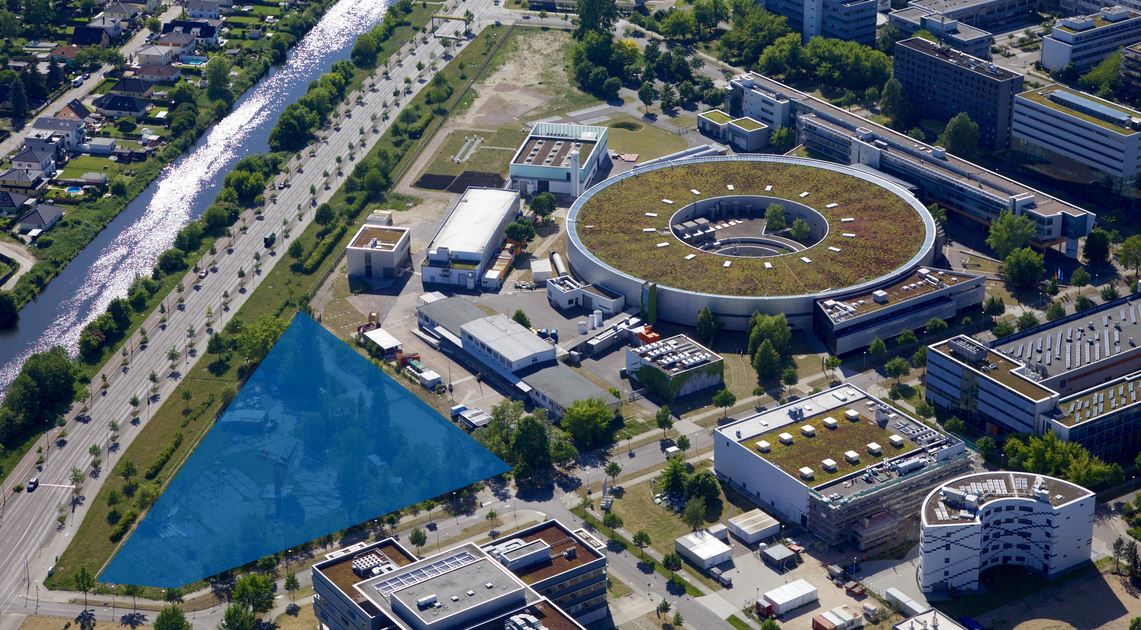 Das neue CatLab (blaue Fläche) soll in unmittelbarer Nähe zu BESSY II, EMIL und weiteren Laboren gebaut werden – Foto © HZB