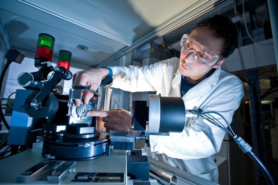 Am Fritz-Haber-Institut untersuchen Forscher Reaktionsbeschleuniger mit allem, was die moderne Katalyse-Forschung zu bieten hat. Hier analysiert Stefan Zander mithilfe der Röntgenbeugung die Kristallstruktur eines Kupfer-Zink-Aluminium Systems für die Methanolsynthese – Foto © Norbert Michalke für Max-Planck-Gesellschaft