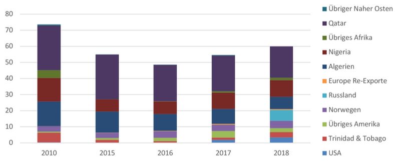 LNG trägt erheblich zur Diversifizierung des Erdgasangebots in Europa bei. Die Anzahl der LNG-Anbieter auf dem europäischen Markt ist doppelt so hoch wie die Anzahl der Pipeline-Anbieter.[7] Europa bezieht LNG insbesondere aus dem Nahen Osten (Qatar), Afrika (Nigeria) und dem amerikanischen Kontinent (aus Trinidad & Tobago, seit Kurzem aus den USA). Auch die großen Pipeline-Anbieter im europäischen Markt liefern kleinere Mengen LNG nach Europa (Algerien seit 1964, Norwegen seit 2007, Russland seit 2016).