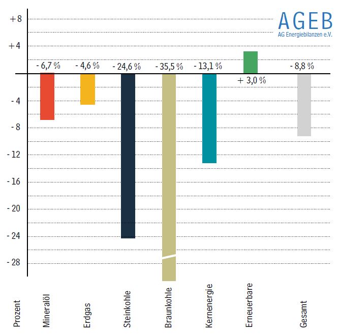 Nach Ablauf der ersten sechs Monate lag der gesamte Energieverbrauch mit 5.961 Petajoule (PJ) beziehungsweise 203,5 Millionen Tonnen Steinkohleneinheiten (Mio. t SKE) um 8,8 Prozent unter dem Vorjahreszeitraum. Für die rückläufige Verbrauchsentwicklung sind vor allem die gesamtwirtschaftlichen Auswirkungen der Corona-Pandemie verantwortlich. Dabei fiel die Veränderungsrate beim Energieverbrauch merklich höher aus als der Rückgang der gesamtwirtschaftlichen Leistung, der 6,6 Prozent erreichte. Auch die im Vergleich zum Vorjahr vergleichsweise milde Witterung wirkte leicht verbrauchsdämpfend.