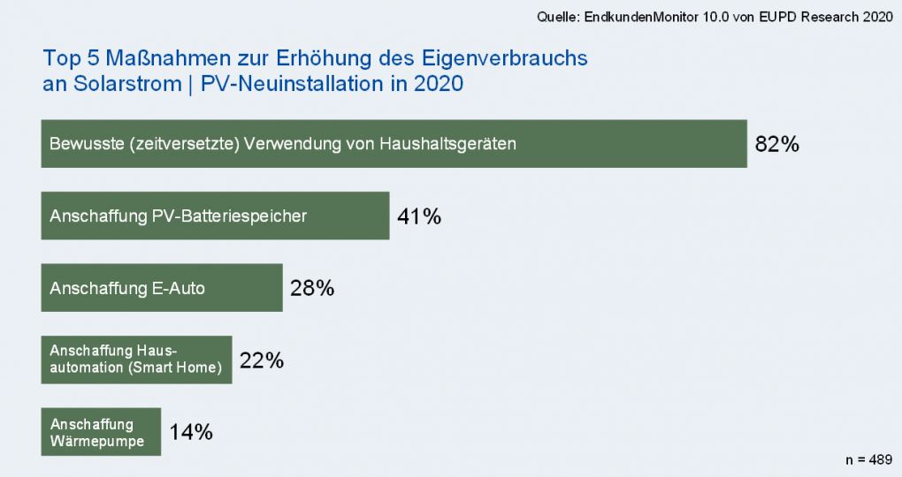 Der zusätzliche Stromverbrauch des E-Autos von 2.500 bis 4.000 kWh lässt so den Eigenverbrauch stark wachsen und zahlt sich gleichzeitig im Geldbeutel aus. Dem aktuellen Strompreis für private Haushalte von gut 31 Eurocent je Kilowattstunde stehen hier Stromgestehungskosten einer neuen Solaranlage von unter zehn Eurocent gegenüber. Smart Home Applikationen befinden sich für gut ein Fünftel der PV-Anlagenbesitzer in 2020 gleichermaßen im Fokus zur Eigenverbrauchsmaximierung, wie auch die Anschaffung einer Wärmepumpe zum strombasierten Heizen.