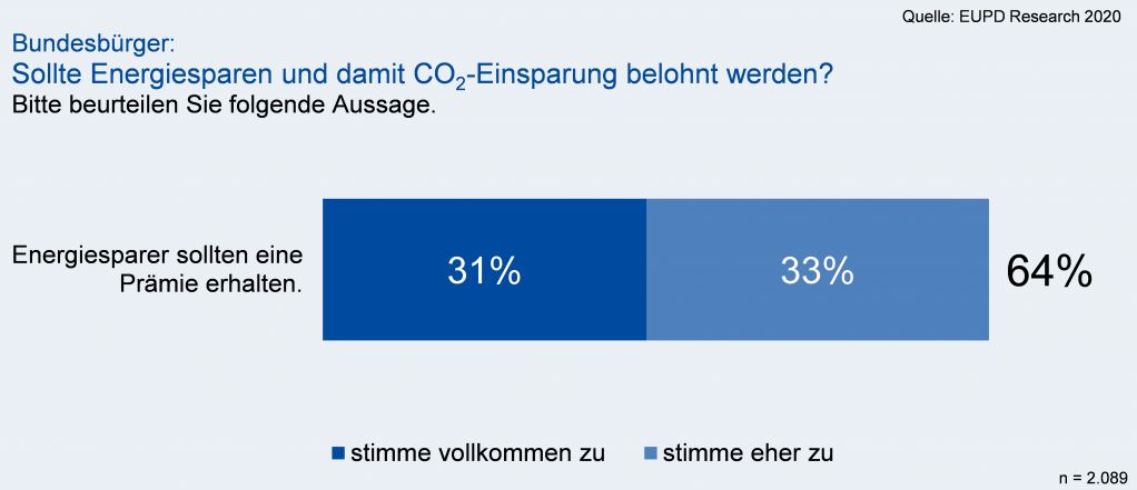 Die Bürger sehen außerdem die Vergabe von Prämien für klimafreundliches Handeln als sinnvoll an. Zwei Drittel der Befragten sprechen sich dafür aus, dass Maßnahmen für das aktive Einsparen von CO2 belohnt werden sollen. Hierunter würde zum Beispiel der Umstieg von veralteten Strom- und Wärmeanlagen auf moderne Technologien fallen, die auf erneuerbaren Energien basieren – wie etwa die Wärmepumpe oder die Elektromobilität.