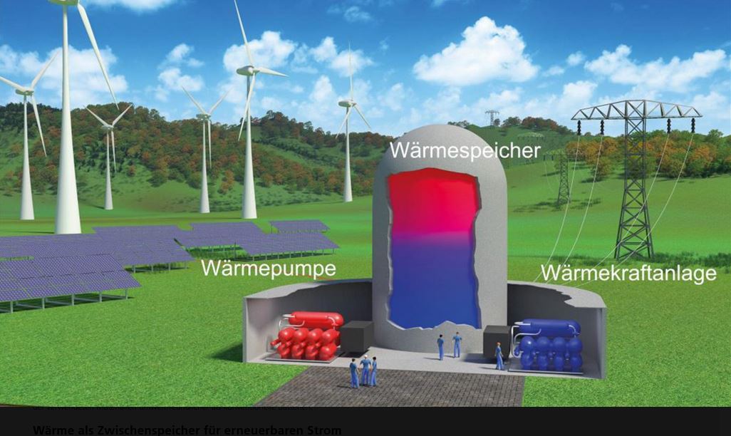 Eine Carnot-Batterie wandelt mittels einer elektrischen Wärmepumpe gerade nicht benötigten, erneuerbaren Strom in Wärme um. Diese wird in einem kostengünstigen Medium, wie Wasser oder Flüssigsalz, zwischengespeichert. Bei Bedarf lässt sich mittels einer Wärmekraftmaschine die Wärme wieder in Strom zurückumwandeln, wie bei einer Dampfmaschine mit einem Generator.