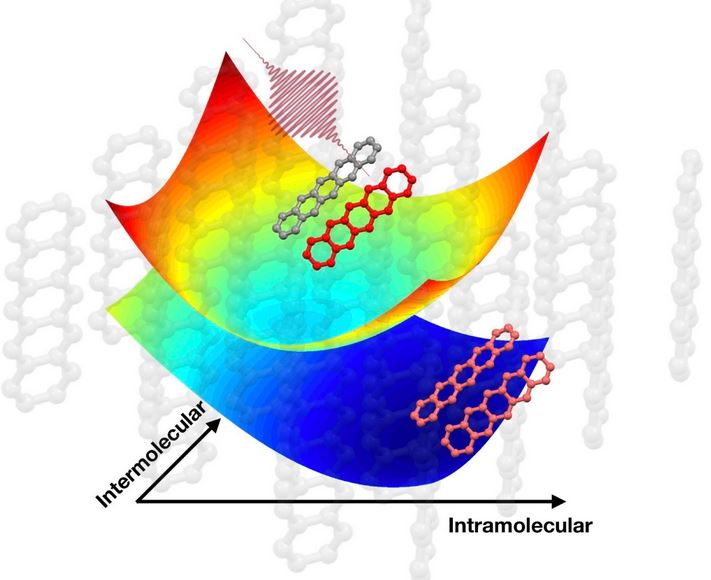 Pentacen zeichnet sich durch seine ultraschnelle „Singulettexzitonenspaltung“ aus – einen potenziell wichtigen Prozess für die Entwicklung neuartiger Solarzellen. Die jüngsten Versuche vertieften das das Verständnis der Singulettexzitonenspaltung in Pentacen und zeigten, dass Pentacenmoleküle charakteristische Schaukelbewegungen und spezifische Vibrationen entwickeln, sobald das Material Licht absorbiert. Diese Bewegungen spielen bei der Umwandlung des Lichts in elektrische Energie in Solarzellen eine entscheidende Rolle auf der Suche nach „einer kostengünstige Photovoltaik der dritten Generation mit verbessertem Wirkungsgrad bei der Energieumwandlung“ (Science Advances).