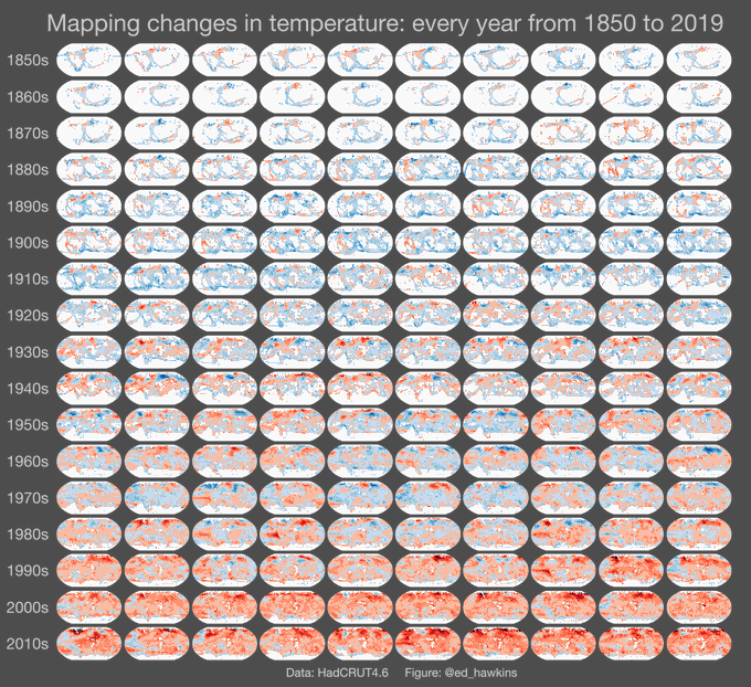 Die Visualisierungstechnik der ‚kleinen Vielfachen‘ (‘small multiples’) wird oft verwendet, um einfache Botschaften zu vermitteln. Das Beispiel des britischen Klimaforschers Ed Hawkins, Professor für Klimawissenschaft im National Centre for Atmospheric Science (NCAS) an der University of Reading, IPCC AR5-Ko-Autor und IPPCC AR6-Lead-Autor, zeigt Karten der Temperaturänderung von 1850-2017 – der allgemeine Erwärmungstrend ist offensichtlich, auch wenn die Details unscharf sind. Schon früher hat Hawkins den Anstieg der Erdmitteltemperatur als Spiale visualiert – bekannt sind auch seine „Warming Stripes“.