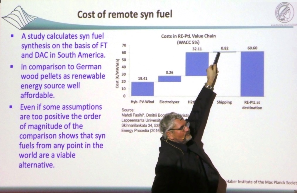 Entwicklung von Synthesekraftstoffen auf der Basis von FT (Fischer-Tropsch) und DAC (Direct Air Capture) in Patagonien, Südamerika – selbst im Vergleich zu deutschen Holzpellets als Erneuerbarer Energieträger erschwinglich. Auch wenn einige Annahmen zu positiv sind, zeigt die Größenordnung des Vergleichs, dass Synthesebrennstoffe von jedem Punkt der Welt eine brauchbare Alternative darstellen. Die Transportkosten fallen nicht ins Gewicht (Robert Schlögl) – Foto © Gerhard Hofmann für Solarify – Quelle: Mahdi Fasihi et al. / Energy Procedia 99 ( 2016)